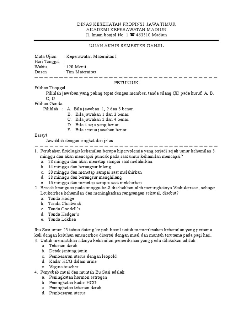 Skripsi merupakan suatu karya tulis ilmiah yang berupa paparan tulisan dari hasil penelitian, dan membahas suatu permasalahan dalam bidang ilmu tertentu serta menggunakan. Soal 2 seorang perempua numur 30 tahun p3a0, 7 hari postpartum mengatakan demam sejak 2 hari yang lalu, persalinan ditolong oleh dukun, dating kebidan dengan keluhan demam, pusing dan badan terasa lemas, ppv cairan berbau. Ia memiliki 2 anak dengan usia 1,8 tahun dan 8 bulan. Dibawah ini adalah contoh soal uji kompetensi keperawatan maternitas beserta kunci jawabannya 1. Kasus i antenatal care diana seorang wanita karier usia 30 tahun, baru menikah 5 bulan yang lalu.